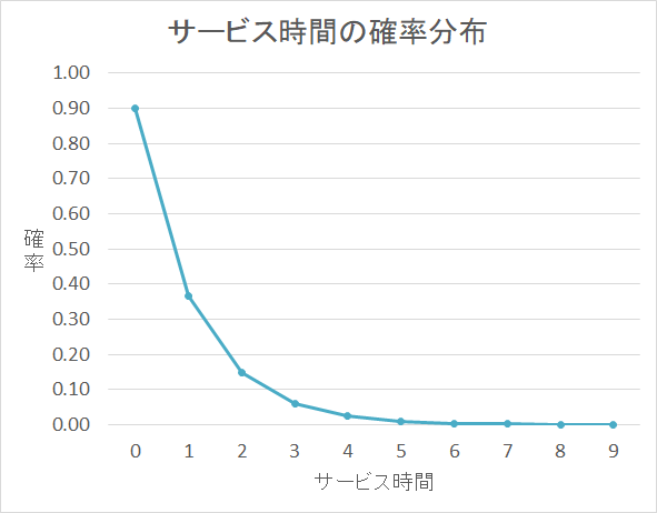 サービス時間の分布は、サービス時間が短い場合が多く、サービス時間が長い場合はそれほど多くないといった事象が一般的で、指数分布のグラフを取ります。