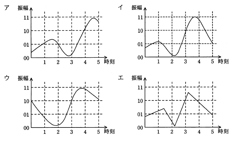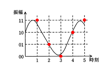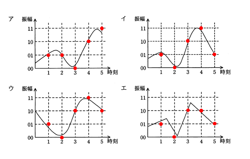 ITパスポート 平成22年春 問88 2017.09.14 音声信号をデジタル化する。図の時刻1から時刻5のタイミングで標本化を行い、4段階に量子化(標本点に最も近い段階を選択)を行なった。その後2ビットで符号化を行なった。結果は「11 01 00 10 11」であった。同じ手法でデジタル化を行うと、「01 00 10 11 01」となる音声信号を表す図はどれか。 Show answer ITパスポート過去問 , 情報に関する理論