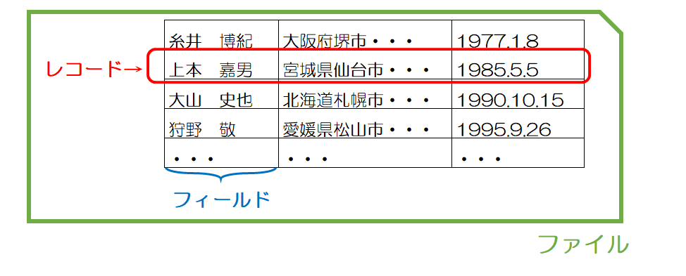 また、同じフィールドを持つレコードの集まりのことを「ファイル」といいます。