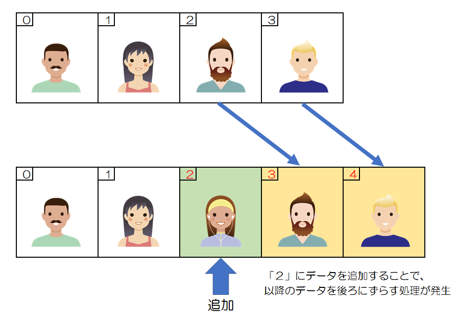 配列は構造が単純で、先頭から順に読み込んでいくには便利ですが、データの論理的な順序どおりに物理的にも並んでいるように作られていないといけないので、後からデータを追加したり、削除したりする場合に、そこから後ろのデータを全てずらして書き直さなければならないというデメリットがあります。