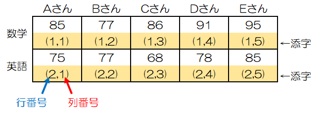 二次元配列を使う場合には添字が二つ必要となり、添字の1つ目が行番号、2つ目が列番号となります。