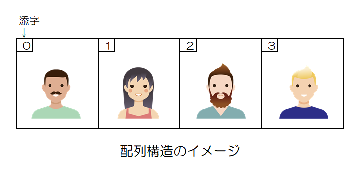 配列におけるそれぞれの変数は「配列要素」または「要素」と呼ばれます。要素にはそれぞれを区別するために順番に番号が振られています。この番号のことを添字(インデックス)といい、添字を指定すると、配列の中から特定のデータを任意の順番で探し出すことが出来ます。