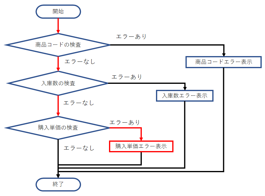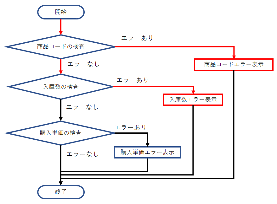 - エ: 商品コード、又は入庫数のどちらかにエラーが有る場合、購入単価にエラーが有っても購入単価エラーは表示されない。