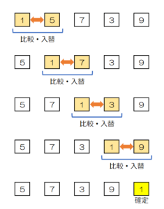 この時点で、要素[5]が最小値になるので、要素[5]の位置が確定する。 - 要素[1]~[4]について、同様に比較と入れ替えを繰り返し、各要素の位置を確定する。