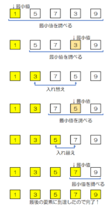 - 1.で求めた最小値を先頭の要素と交換する。
