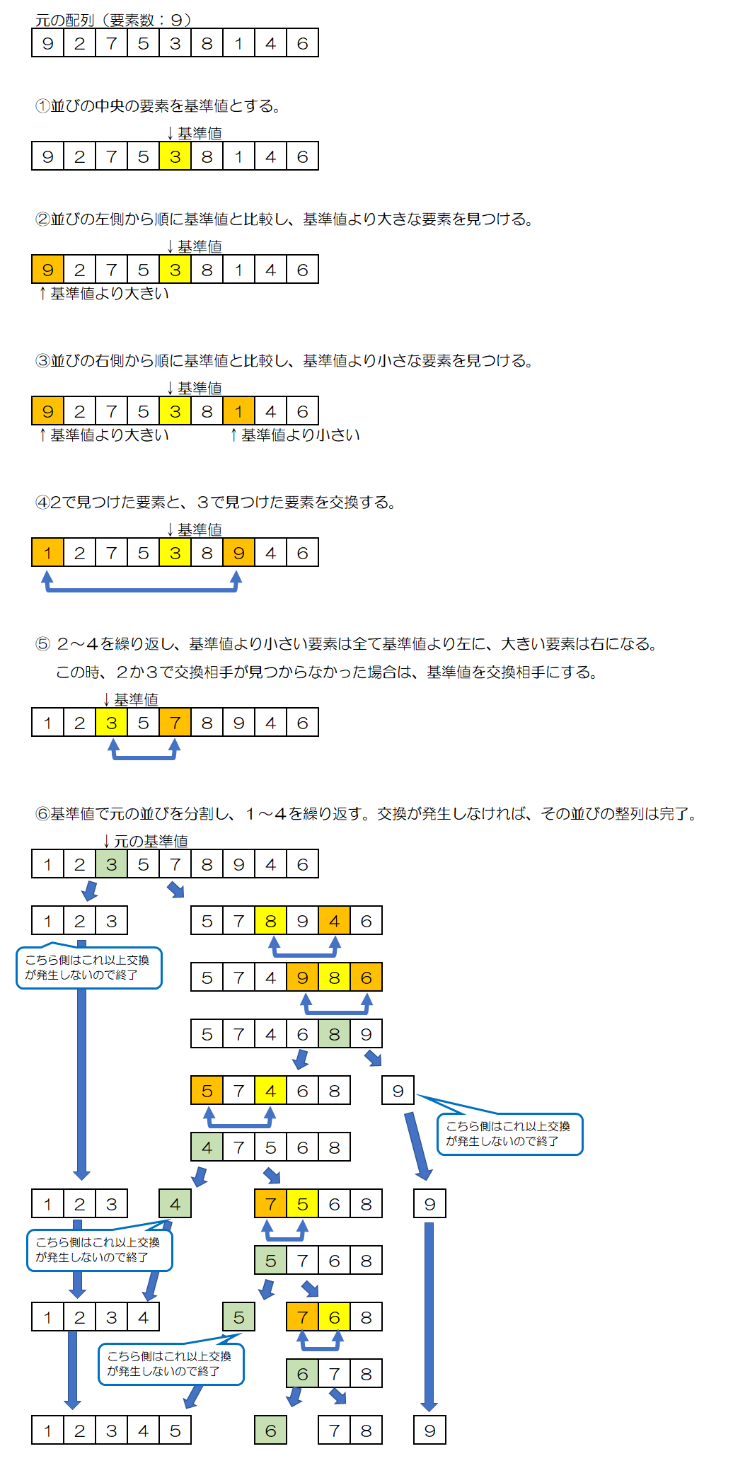- 適当な基準値を定めて、その値より小さい要素を前の方に移し、その値以上の要素を後の方へ移す。