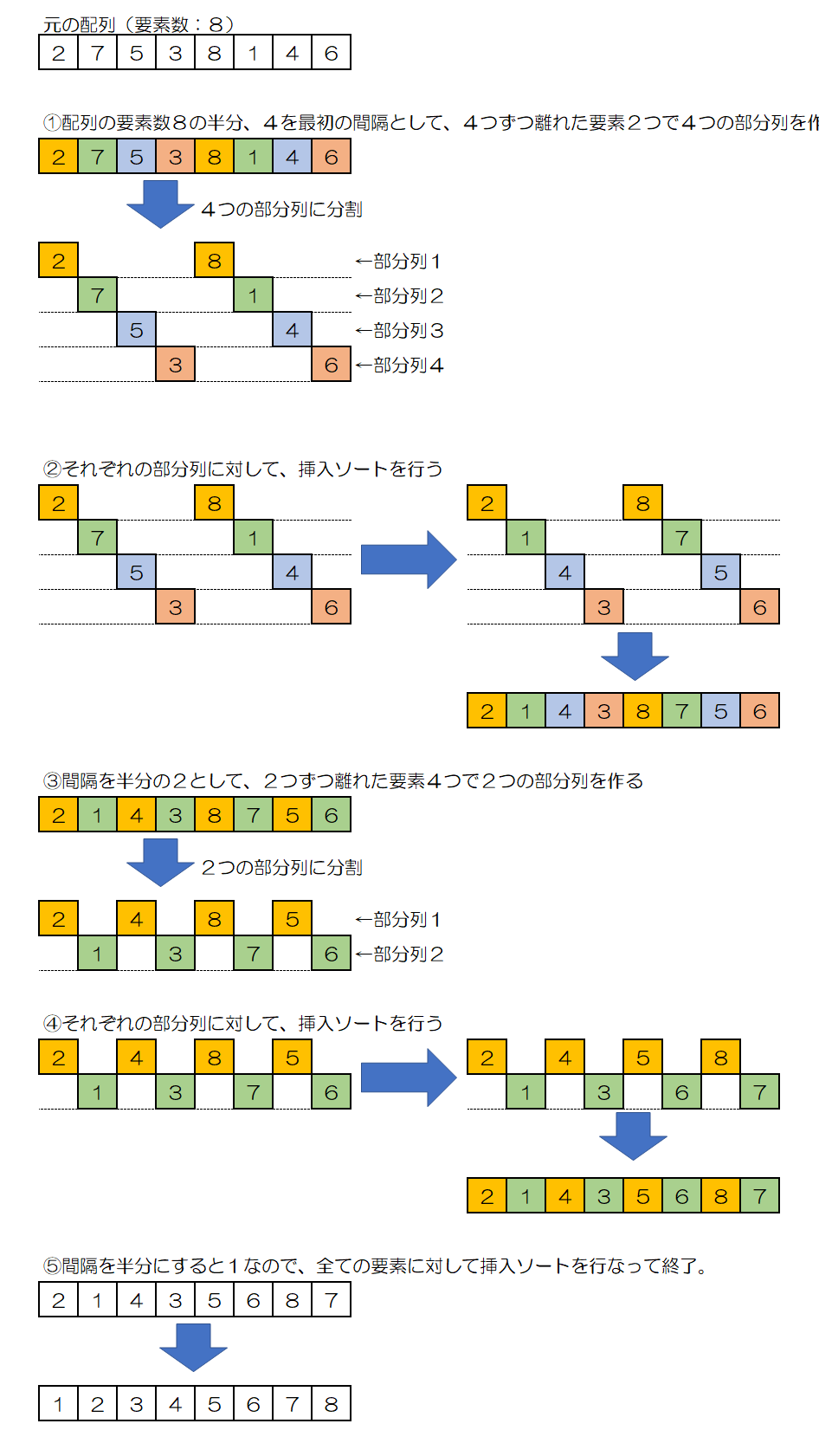 - 適当な間隔を決めて、等間隔の飛び飛びの要素で作った部分的な並びに対して挿入ソートを適用する。
