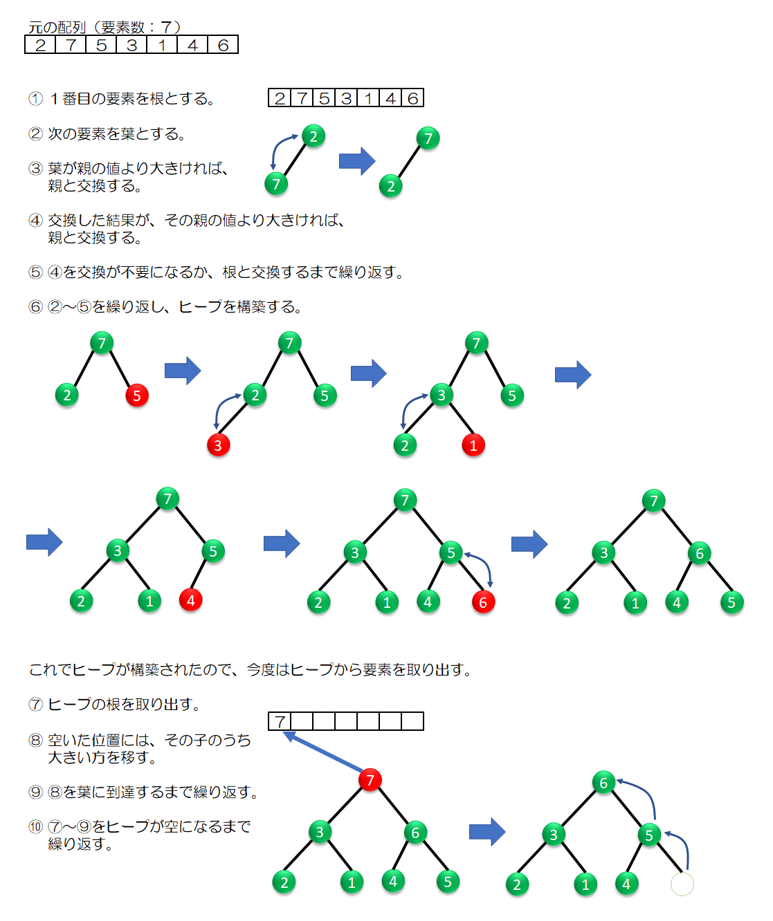 - 2と3をヒープの要素がなくなるまで繰り返します。