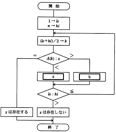 昇順に整列された n 個のデータが格納されている配列 A がある。流れ図は, 2分探索法を用いて配列 A からデータ x を探し出す処理を表している。 a, b に入る操作の正しい組合せはどれか。ここで,除算の結果は小数点以下が切り捨てられる。
