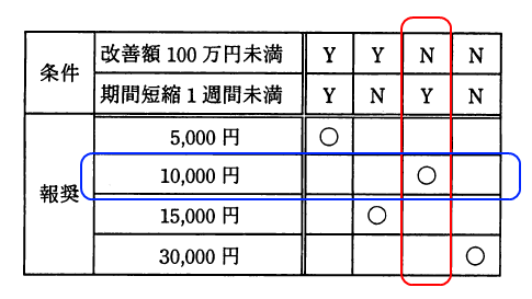 業務の改善提案に対する報奨を次の表に基づいて決める時、改善額が200万円で、かつ、期間短縮が3日の改善提案に対する報酬は何円になるか。ここで表は、条件が成立する場合はYを、不成立の場合はNを記入し、これらの条件に対応した時の報奨を○で表してある。