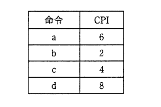 基本情報技術者 平成19年春 問19 2017.10.11 あるプログラムは,命令 a ~ d を次の順で実行する。 各命令の実行に必要なクロックサイクル数(CPI:Cycles Per Instruction)は, 表のとおりである。 CPU の1クロックサイクル時間を 10 ナノ秒とするとき, この命令列の実行時間は何ナノ秒か。 ア: 30 イ: 40 ウ: 200 エ: 300 Show answer 基本情報過去問 , プロセッサ