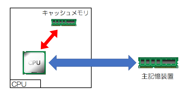 CPUのデータ処理速度に比べると、CPUと主記憶装置間のデータ転送は遅いので、主記憶装置とのやり取りの際にCPUが待たされることがあります。