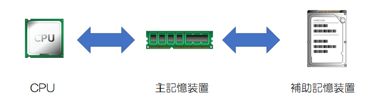 主記憶装置は、CPUから要求されたデータが自身のもとになければ、補助記憶装置からそのデータを読み込み、CPUに渡します。
