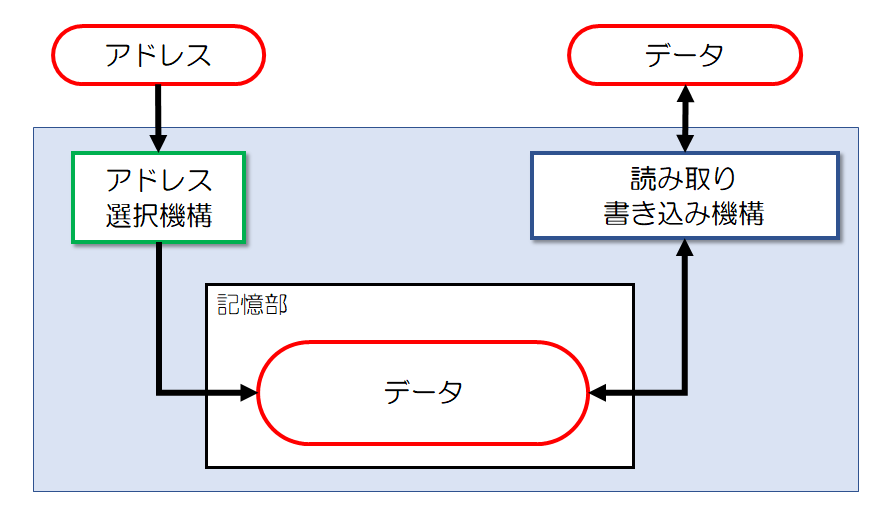 用語例:記憶部,アドレス選択機構,読取り書込み機構,ECC(誤り検出訂正),パリティ