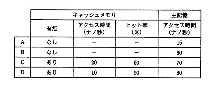 A~Dを、主記憶の実効アクセス時間が短い順に並べたものはどれか。