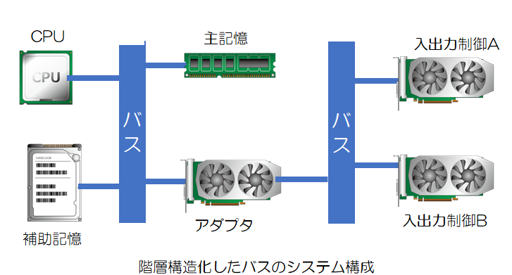 速度の遅い入出力装置のバスを、高速な装置用のバスと階層構造にする方法もあります。