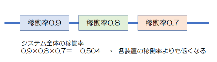 二つ(又はそれ以上)のサブシステムが直列の状態で連結している構造のシステムでは、いずれかのサブシステムが停止するとシステム全体の機能が停止してしまいます。この場合、システム全体の稼働率は各サブシステムの稼働率をかけ合わせた値となります。