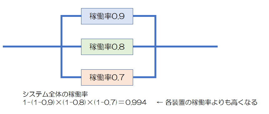 いくつかの装置やシステムを組み合わせて構築したシステム全体の信頼度は、個々の装置などの稼働率から求めることができます。
