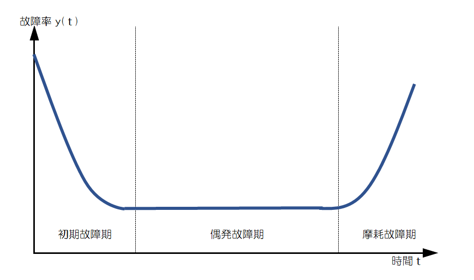 時間経過により、初期故障期、偶発故障期、摩耗故障期の3期に分けられます。