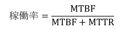 全稼働時間を「MTBF+MTTR」とし、全稼働時間のうち正常に稼働した時間(MTBF)の割合を稼働率として求めます。