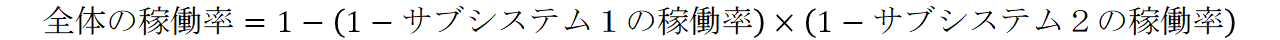 二つ(又はそれ以上)のサブシステムが並列の状態で連結している構造のシステムは、いずれかのサブシステムが停止しても、残りのサブシステムで処理と代行できるため、システム全体の停止を避けられる構造です。この場合、システム全体の稼働率は以下の式で求めます。