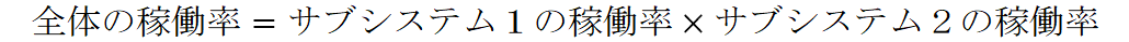 二つ(又はそれ以上)のサブシステムが直列の状態で連結している構造のシステムでは、いずれかのサブシステムが停止するとシステム全体の機能が停止してしまいます。この場合、システム全体の稼働率は各サブシステムの稼働率をかけ合わせた値となります。