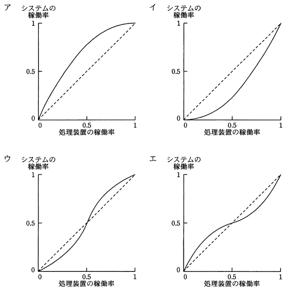 2台の処理装置が直列に接続されているシステムがある。両方の処理装置が正常に動作しないとシステムは稼働しない。両方の処理装置の故障の発生は独立しており、稼働率が等しい場合の処理装置の稼働率とシステムの稼働率の関係を表すグラフの形はどれか。