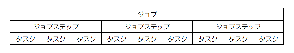 ジョブステップとは、一つのジョブを構成するより小さな単位です。ジョブとタスクの中間のまとまりです。一つのジョブステップが一つのプログラムの実行に相当します。
