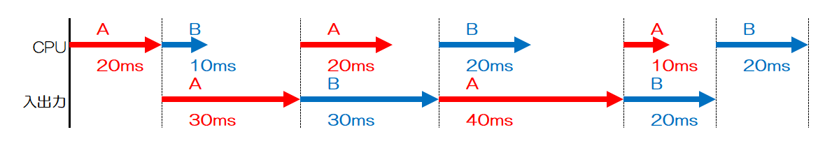 - プログラムB:CPU(10ms)→I/O(30ms)→CPU(20ms)→I/O(20ms)→CPU(20ms)