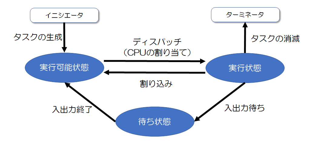 タスクが生成されると「実行可能状態」になります。ディスパッチャによって実行可能状態から「実行状態」になります。