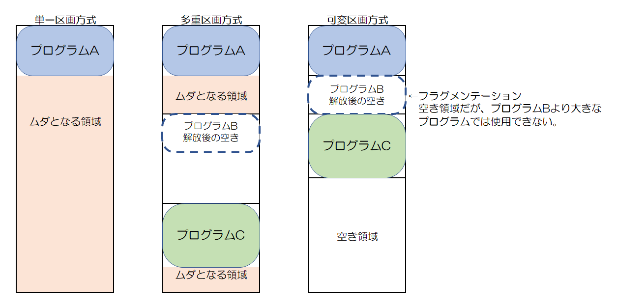各プログラムの実行が終了すると、使用していた領域は開放されます。次々に実行されるプログラムの使用領域の大きさはそれぞれ異なるので、空き領域が細分化されて利用しにくくなるという、フラグメンテーションが発生します。
