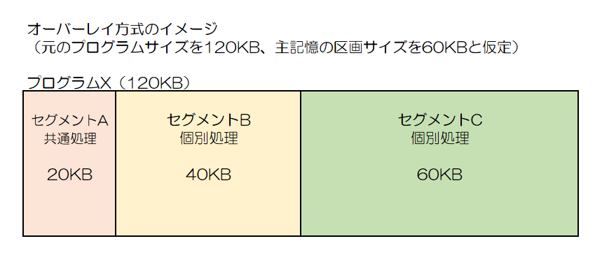 オーバーレイ方式は、一つのプログラムを主記憶装置の区画に収まる大きさのセグメントに分割しておき、実行するセグメントをその都度外部記憶装置からロードする方式です。オペレーティングシステムの主記憶管理よりも、プログラム側とプログラム管理が主記憶装置の使用方法を考慮する方式です。