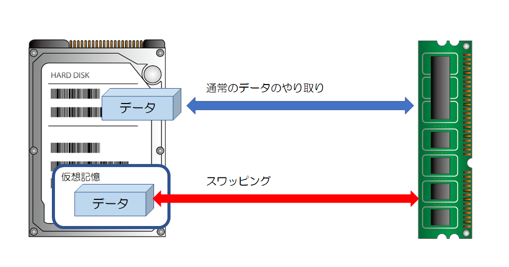 処理しなければならないプログラムやデータが主記憶装置の空き領域に格納しきれない時、一旦ハードディスク上の仮想記憶領域へ一部を書き出し、必要に応じて主記憶装置と仮想記憶の間でプログラムやデータを入れ替えながら処理を進める方法で、この入れ替えをスワッピングといいます。