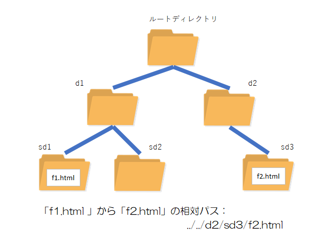 相対パスでは、カレントディレクトリを起点として、親ディレクトリ又は子ディレクトリに移りながら順にたどって参照ファイルに行き着きます。