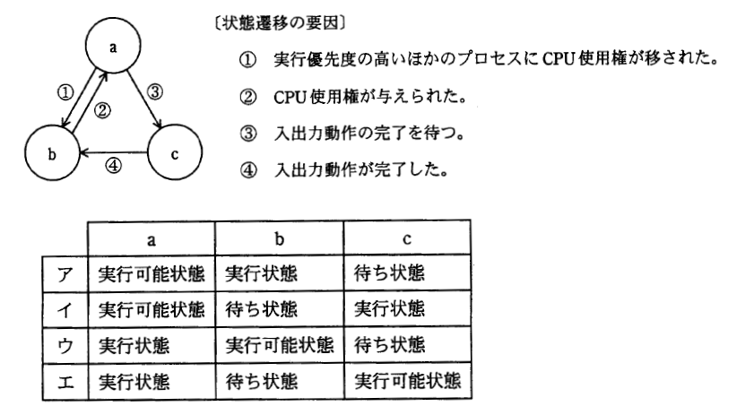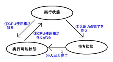 タスク管理によって優先度の高いタスクから実行される(実行状態)。 プログラムが入出力装置を使っている間は、タスクは完了するのを待っている状態(待ち状態)である。