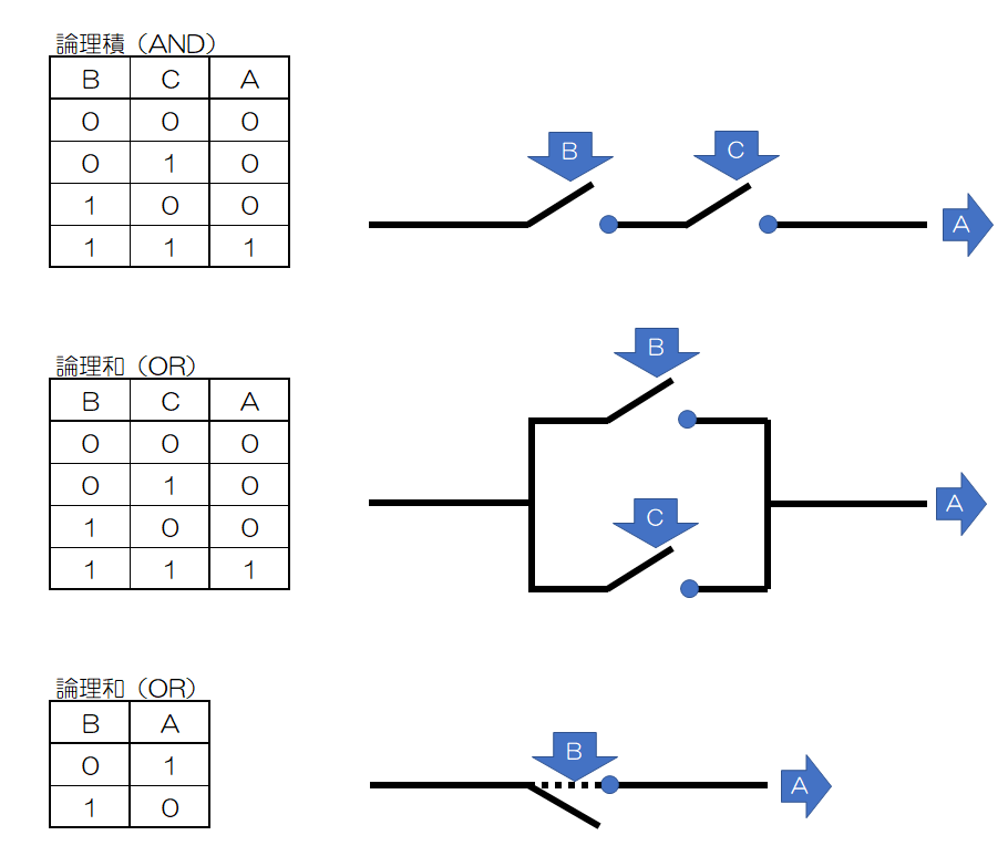 ここではわかりやすいように、トランジスタなどによる回路の代わりに簡単なスイッチを用いて論理演算の原理を説明します。