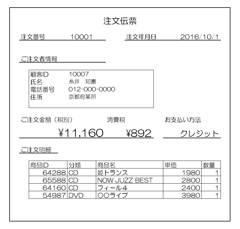 まずは、伝票のたぐいをそのまま表にした状態のものを作ります。この時点では、繰返し項目や導出項目(*)を表の中に含みます。