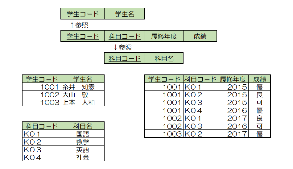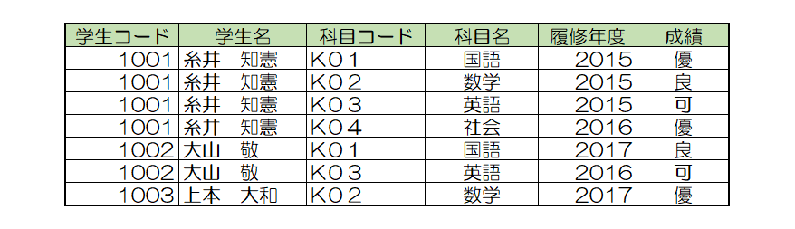 例えば、学生の科目履修に関する「学生コード、学生名、科目コード、科目名、履修年度、成績」という情報を、一つの表に記録したとします。