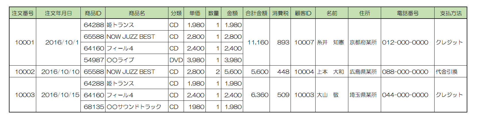 具体的な例として、オンラインショップの商品購入履歴を表にしたものを正規化していきます。