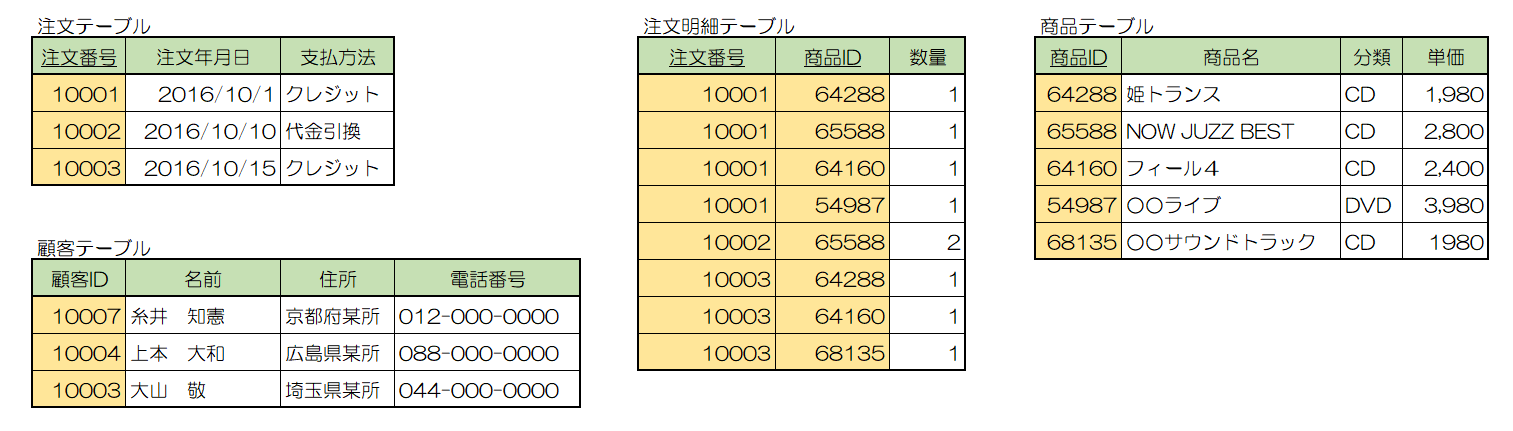 『注文』テーブルのうち、『名前』、『住所』、『電話番号』、は、『顧客ID』によって一意に決まるので、分割できます。『顧客ID』は、『注文』テーブルの主キーではないため、このようなパターンを『推移関数従属』といいます。