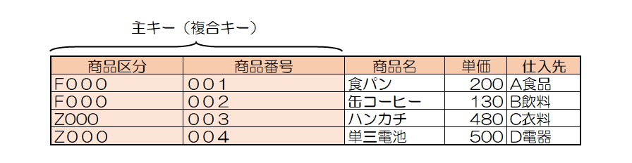 また、ある一つの列の内容だけでは行を特定できない場合、複数の列を組み合わせて主キーとすることがあります。これを複合キーといいます。