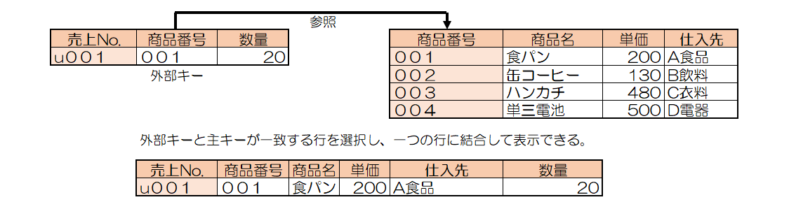 参照する側の表に、参照される表の主キーと同じ内容が登録される列を、外部キーとして持たせておきます。そうすると、外部キーを手がかりに相手の表の主キーと内容が一致する行を探し出し、一つの行として結びつけることができます。