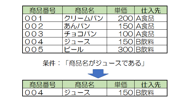 選択は、「商品名=ジュース」のように、一つだけの条件で選ぶ以外に、複数の条件をANDまたはORで組み合わせて使うことができます。