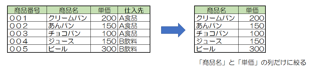 射影とは、表から列を抽出する操作です。幾つかの列からなる表のうち、必要な列のみを表示し、他を非表示にできます。
