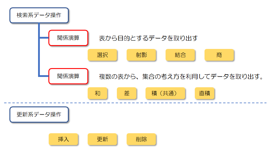 関係データベースにおけるデータ操作には、検索系のデータ操作と更新系のデータ操作があります。
