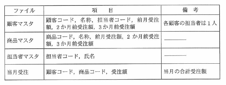 ある企業では,顧客マスタファイル,商品マスタファイル,担当者マスタファイル及び 当月受注ファイルを基にして,月次で受注実績を把握している。各ファイルの項目が 表のとおりであるとき,これら四つのファイルを使用して当月分と直前の3か月分の 出力が可能な受注実績はどれか。