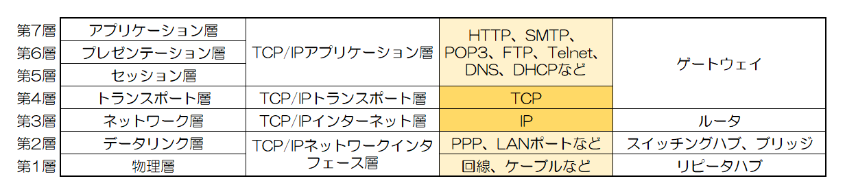TCP/IP をOSI 基本参照モデルの7 階層と対比させながら,各層が果たす役割,提供しているインタフェースを理解する。また,代表的なサービスのポート番号(ウェルノウンポート)などを理解する。