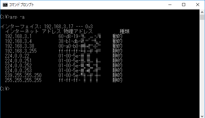 ARPテーブルを表示および変更するためのコマンドです。ARPテーブルとは、IPアドレスとMACアドレスの対応情報です。