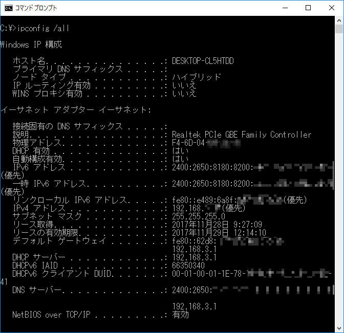 TCP/IPの構成情報を確認します。正しく設定されている場合には、IPアドレスやサブネットマスクなどの値が表示されます。