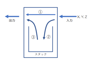 - スタックの一番上にあるデータを取り出して左側に出力する。